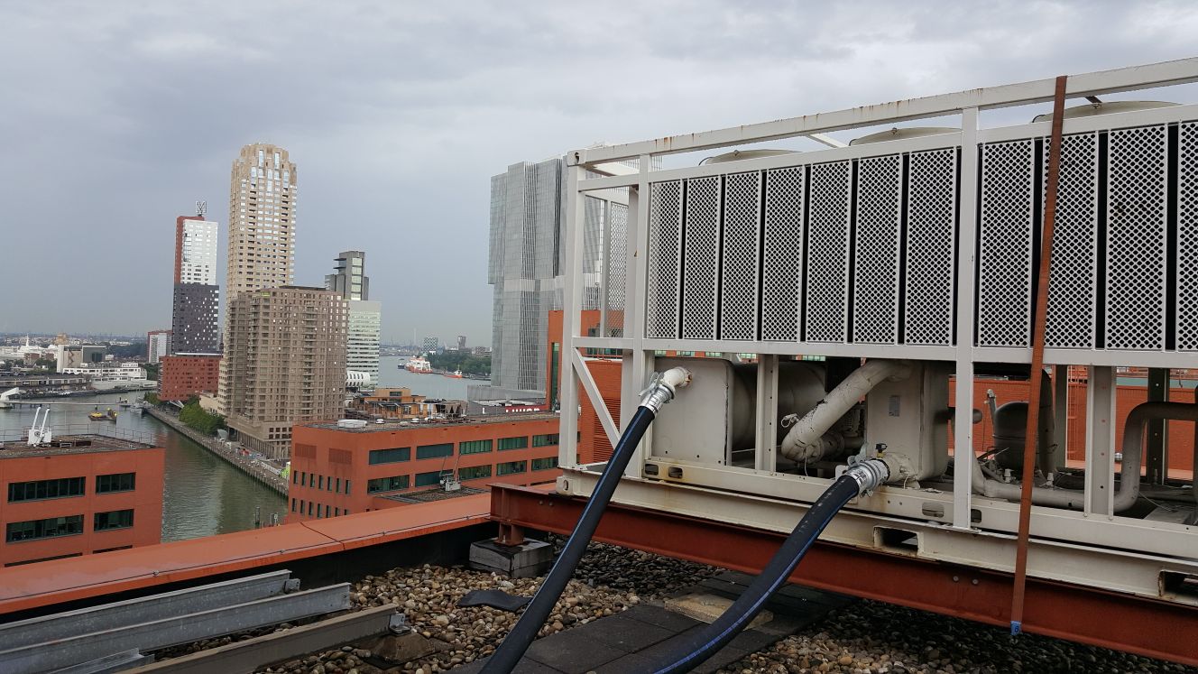 De bestaande chillers stonden op het dak van het gebouw. Onze eigen chillers daarnaast installeren, was uiteraard een hele operatie. Er kwam een stevige kraan aan te pas om de toestellen, één van 200 kW en twee van 375 kW, de lucht in te hijsen. Een mooi uitzicht kregen onze installateurs er wel gratis bij tijdens het aankoppelen van de leidingen.