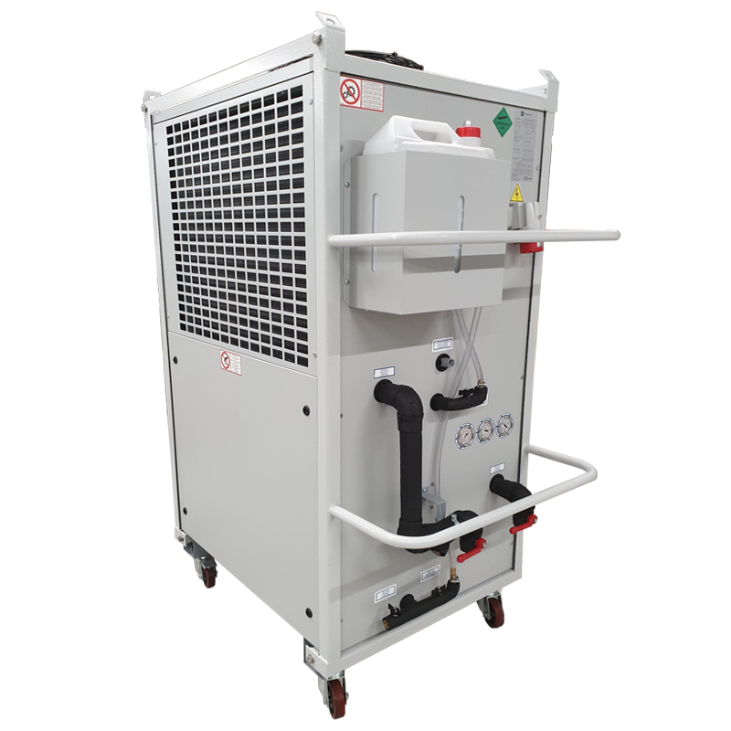 De FC 45 CO is een compacte en krachtige chiller die voor zeer veel toepassingen inzetbaar is. Het toestel heeft een maximaal koelvermogen van 15 kW en is dankzij haar stille werking de ideale keuze voor gebruik in een bewoonde omgeving. De chiller is uitgerust met milieuvriendelijke technologie die zorgt voor een maximaal rendement bij een minimaal elektriciteitsverbruik. Door middel van leidingen en accessoires kan de FC 45 worden aangesloten op nagenoeg elk bestaand systeem. Het kan tevens ook worden aangesloten op fan coils die de gekoelde lucht kunnen uitblazen over specifieke zones of ruimtes. Door de compacte afmetingen en wielen past de chiller door elke deur.